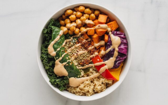 Lunch: Buddha bowl with roasted sweet potato, chickpeas, kale
