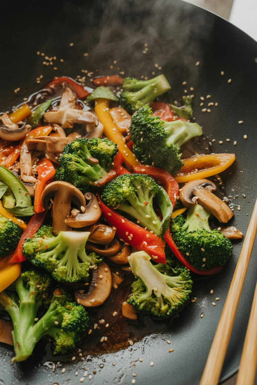 Dinner: Lean beef stir-fry with 3 oz sirloin, broccoli, snap peas, bell peppers, and ½ cup brown rice