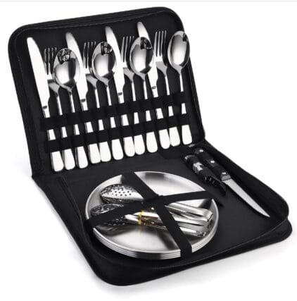 – Cookware (pots, pans, utensils, spatula) – Bring your old kitchen gear or get a camping cookware kit. I like the ease of getting a set with a case, it helps keep things organized.