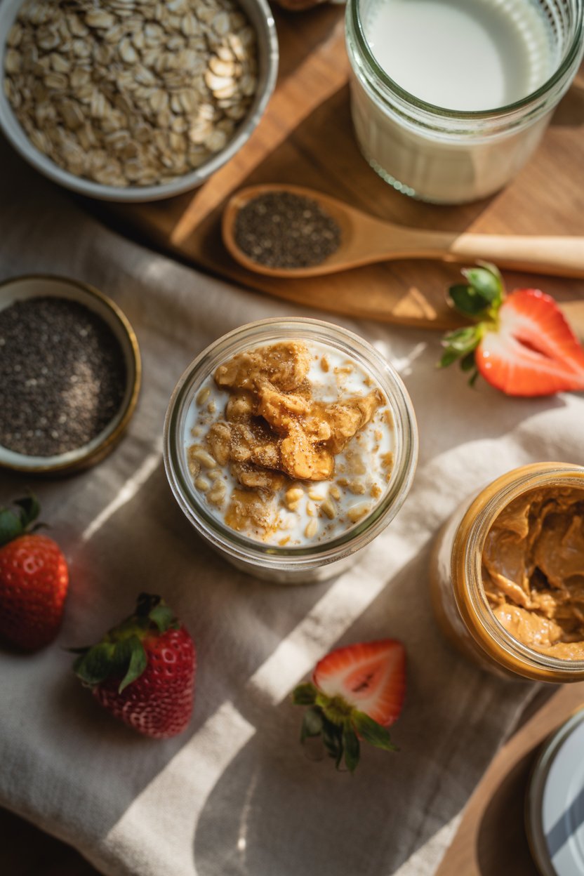 - In the morning, mix well, and add more milk if needed for the desired consistency. Top with strawberries.